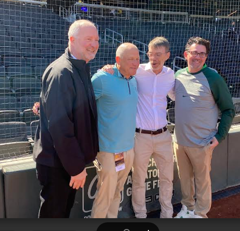 Steve Hill far left and Jeremy Aguero far right with A’s executives Marc Badain and Sandy Dean at A’s spring training game in Las Vegas Saturday.