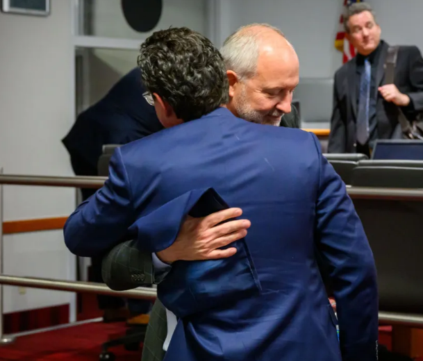 Jeremy Aguero and Steve Hill after Aguero’s final Las Vegas stadium board meeting in 2023.
