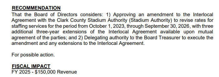 On Tuesday, the LVCVA board cemented the relationship between stadium board and tourism agency by renewing the work contract between the stadium board and the LVCVA. It was a formality as there were no objections. The LVCVA services for the stadium board were extended through Sept. 30, 2026 with a fiscal impact of $150,000.