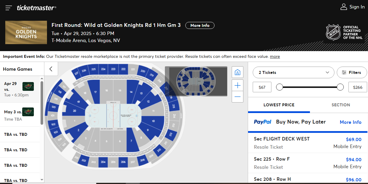 Two hours before the Vegas Golden Knights were about to host the Minnesota Wild in Game 5 of the NHL Stanley Cup playoffs, StubHub has a $47 ticket for Hyde Lounge — plus fees/charges.