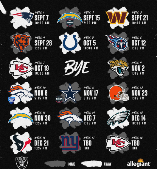 The Raiders open their season on the road against the New England Patriots Sept. 7 and then play their home-opener against the Chargers at Allegiant Stadium on Monday Night Football Sept. 15.