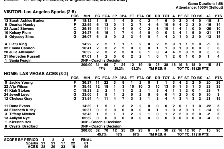 Las Vegas went on a 23-2 run before the Sparks closed the first quarter with a 15-5 spurt of their own to trail, 28-21.