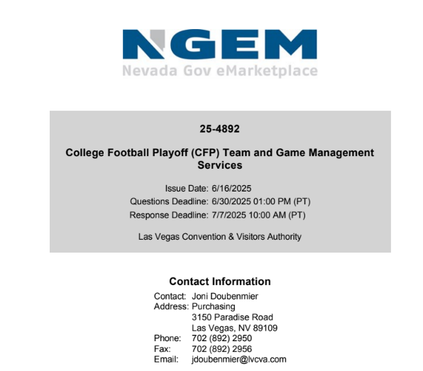 The deadline for any company to submit a bid for the LVCVA consulting job on the 2027 national championship game is July 7.