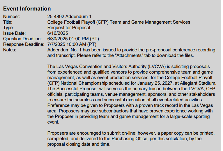 The college football championship game was Jan. 20, while the LVCVA’s deadline for the bid for “sporting event production, public relations and game management services” for the 2027 CFP game in Las Vegas was Feb. 24.