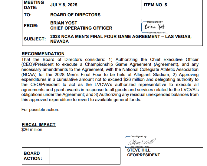 LAS VEGAS, Nevada — LVCVA staff will be asking the Las Vegas Convention and Visitors Authority board Tuesday to approve spending $26 million for college basketball’s Final Four event at Allegiant Stadium in April 2028.