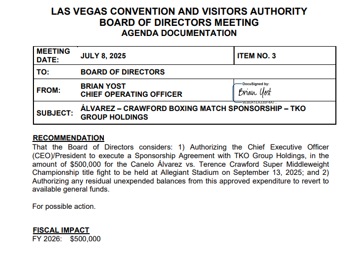 The LVCVA board is also slated to vote on spending $250,000 on UFC International Fight Week in June, $500,000 to TKO Group Holdings to promote the Canelo Alvarez vs Terence Crawford boxing match at Allegiant Stadium in September and $400,000 to The Sports Events & Tourism Association for a symposium in Las Vegas in April 2026.
