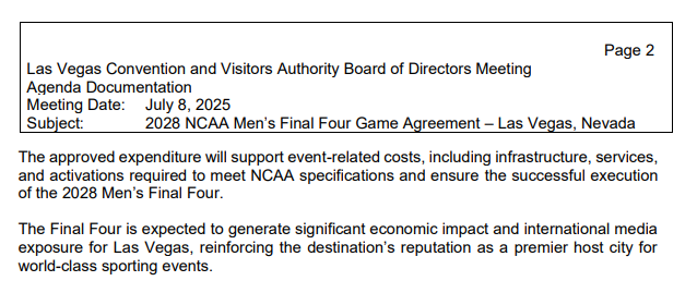 Here’s why LVCVA staff wants the board to approve $26 million in public dollars for the NCAA basketball tournament’s Final Four at Allegiant Stadium, according to Tuesday’s board meeting agenda: