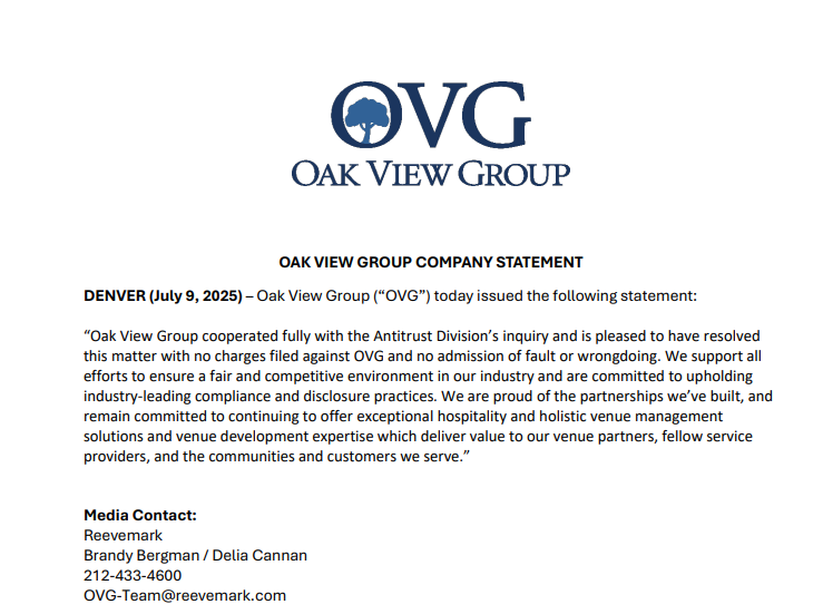 Consistent with the bid-rigging agreement, the competitor did not submit a competing bid for the Arena Project. OVG ultimately submitted the sole qualified bid and won the project.  The arena opened to the public in April 2022, and OVG continues to receive significant revenues from the project to date.