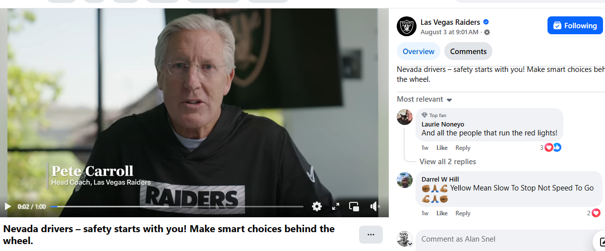 “That PSA was produced by the Raiders Organization,” said Kelsey McFarland, a Nevada Department of Transportation spokesperson in Las Vegas.
