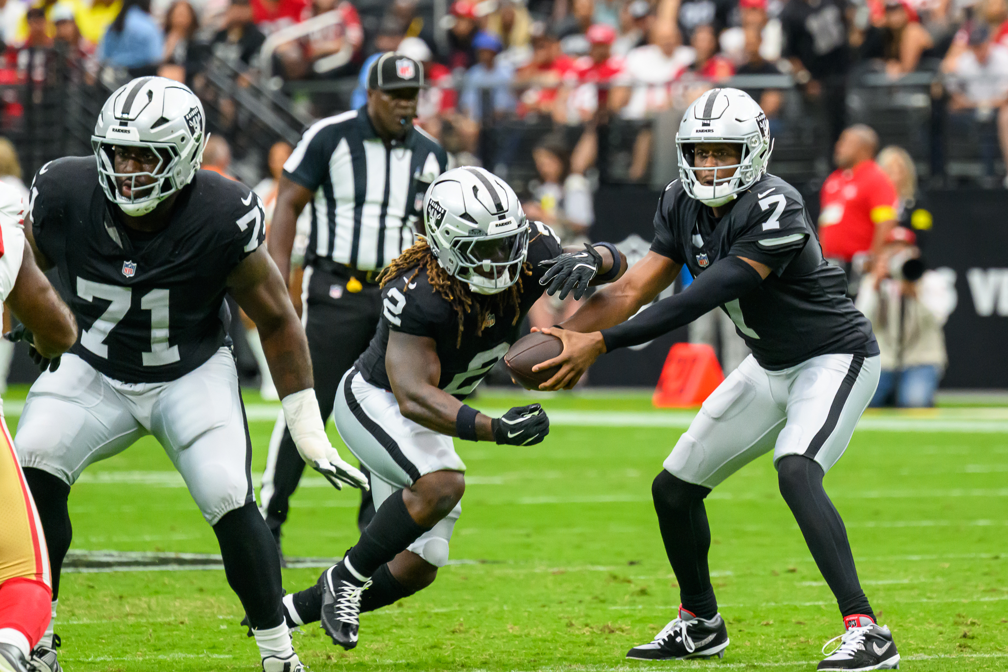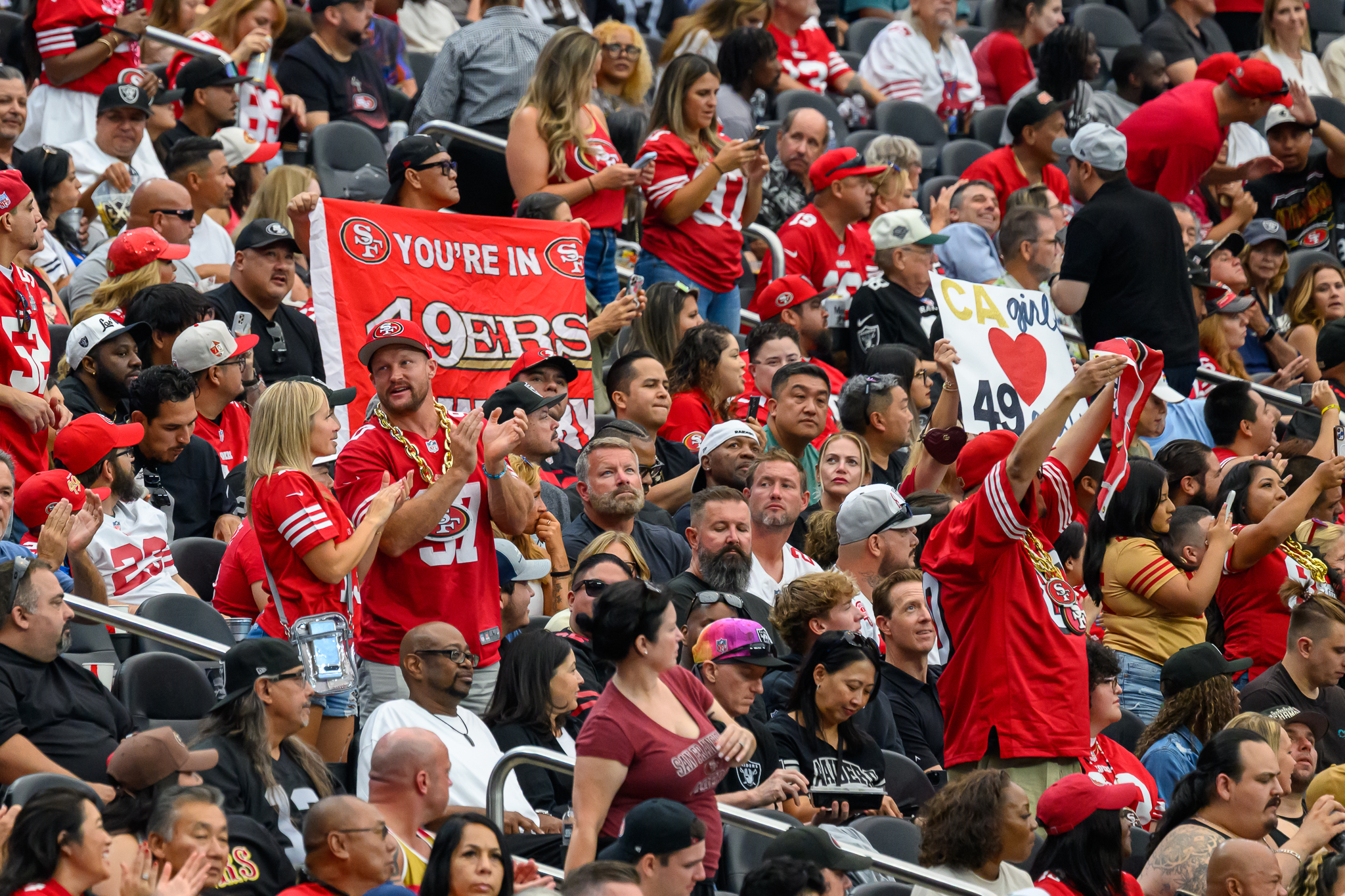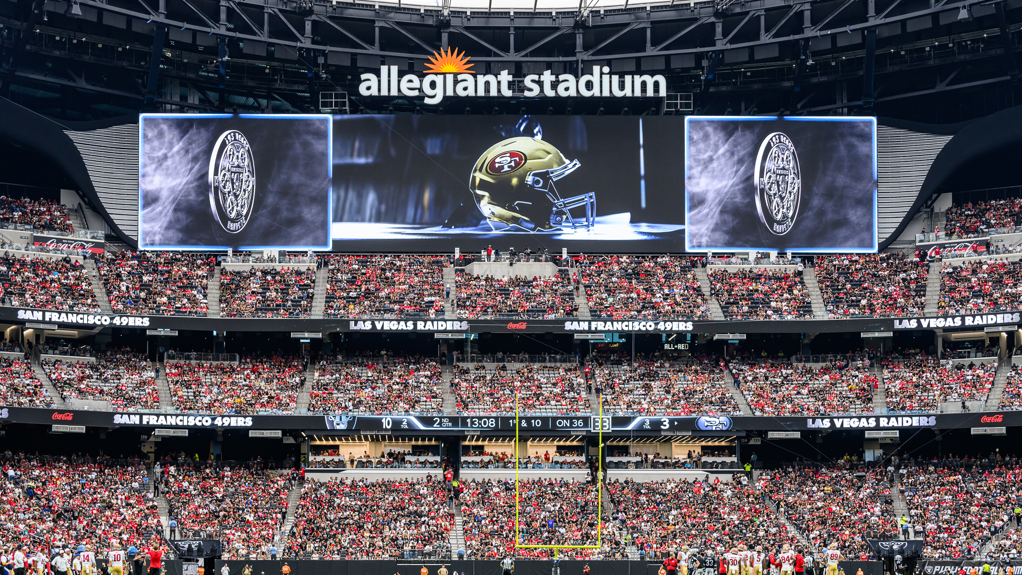 It’s old news at this point — fans of the visiting team at Allegiant Stadium make their presence known. A eyeball look showed about a 50/50 split between 49ers fans and Raiders faithful.