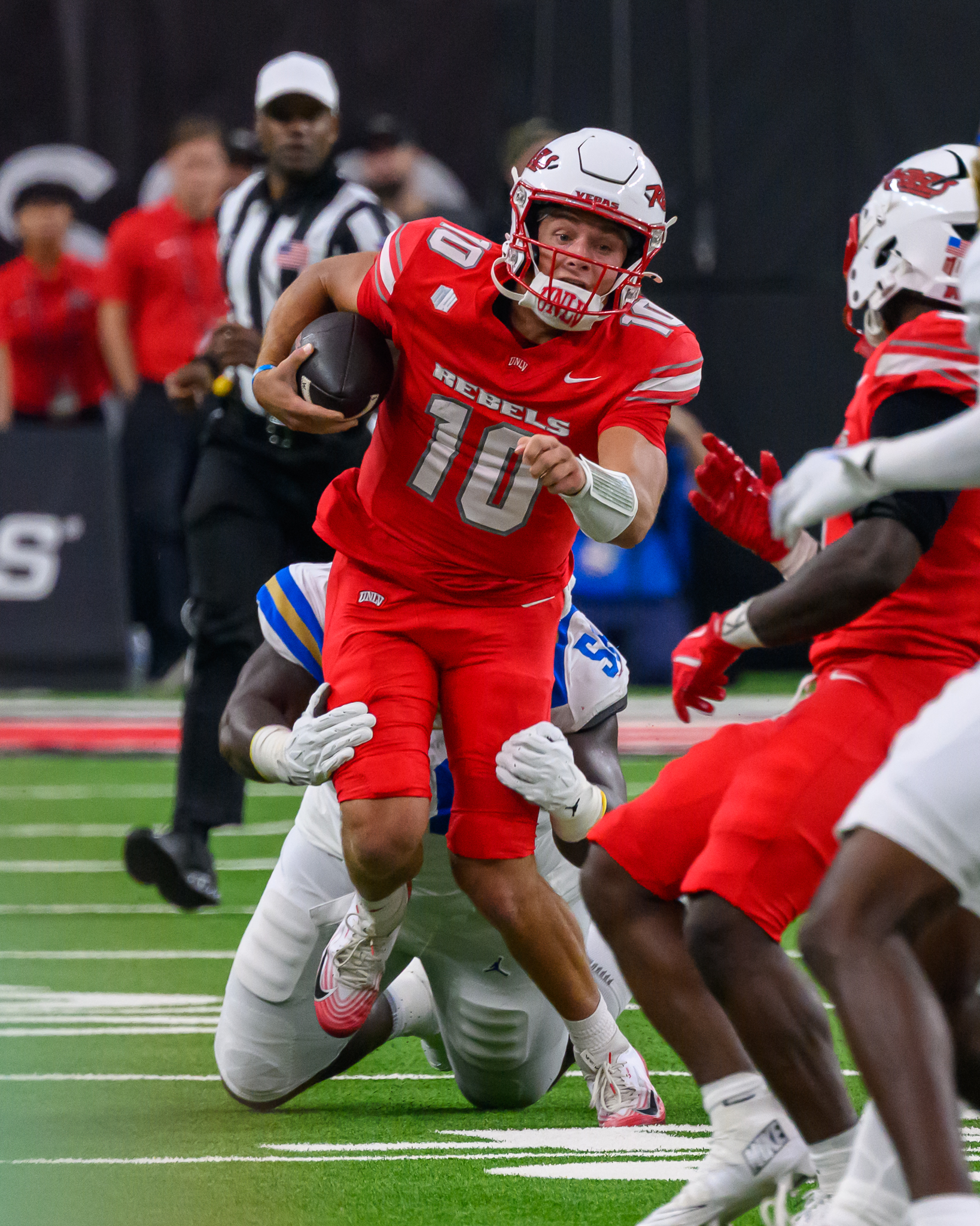 The penalties kept on flying inside the domed Raiders NFL stadium — UCLA had 14 and UNLV had 13 — but the Rebels held off a second half rally by the Bruins to register a 30-23 victory to win their first three games of the 2025 season under new coach Dan Mullen.
