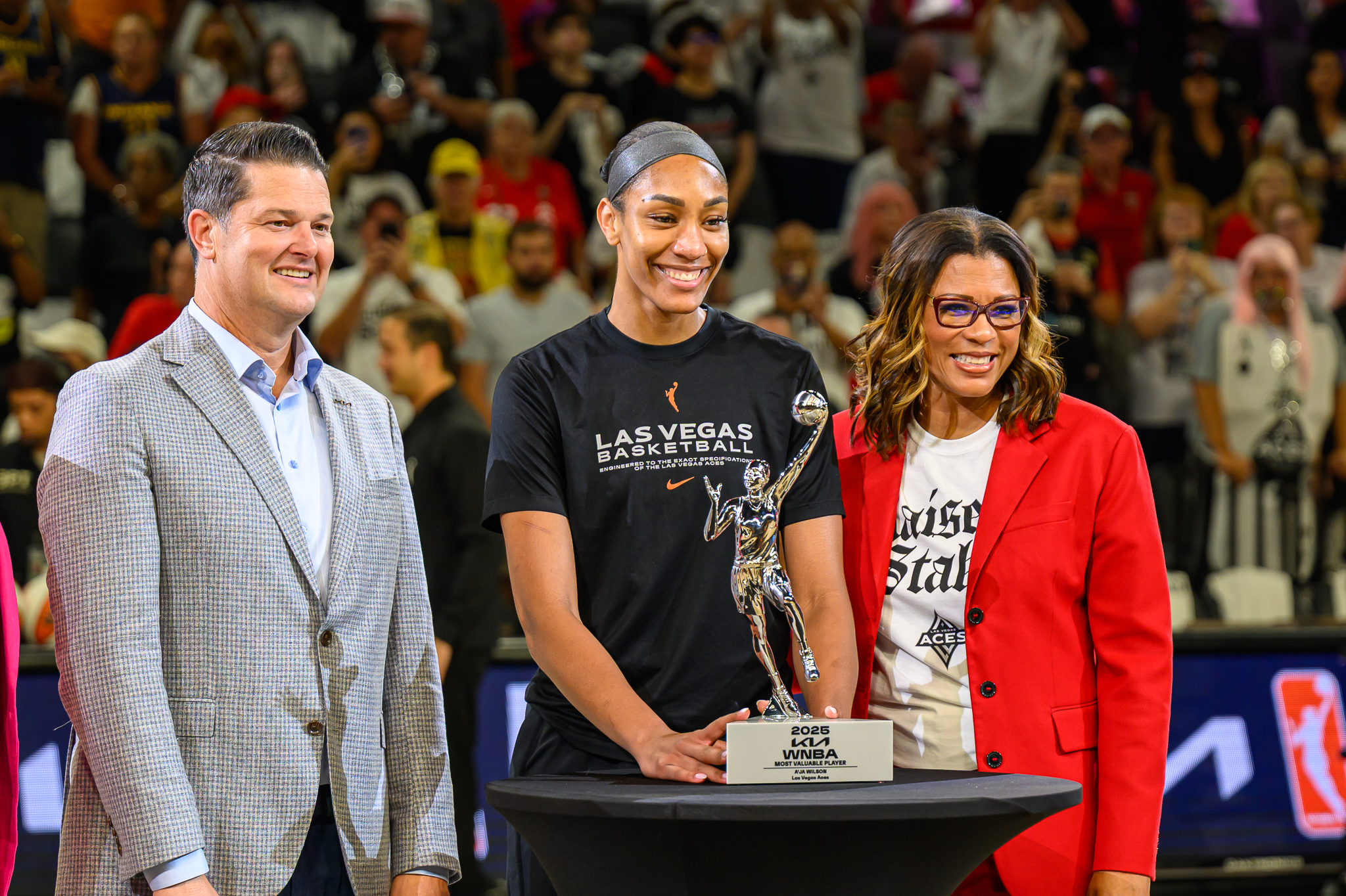 Las Vegas Aces star A’ja Wilson was surprised with the WNBA MVP trophy from none other than her boyfriend, Miami Heat player Bam Adebayo, with Wilson tearfully accepting her fourth MVP award from 2020 to 2025.