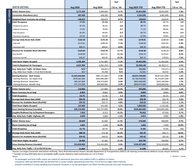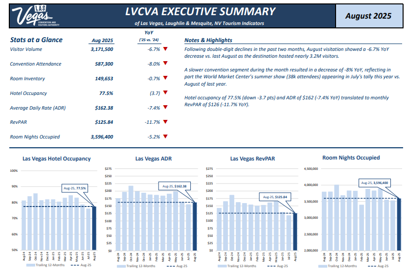 The Las Vegas Visitors and Convention Authority (LVCVA) also convention attendance dropped eight percent to 587,300, while the hotel occupancy rate of 77.5 percent in August was a 3.7 percent drop from August in 2024.