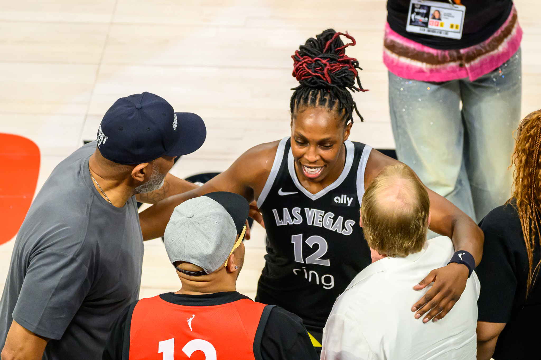 Aces/Raiders owner Mark Davis talking with WNBA Commissioner Cathy Engelbert before Aces playoff game in 2024 . Photos for this story: Hugh Byrne/LVSportsBiz.com