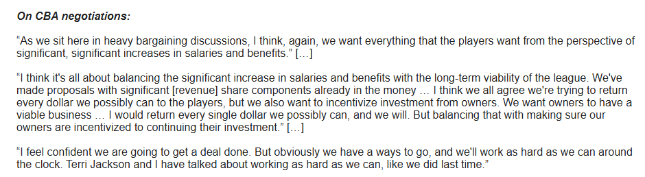 “[The players] are at the center of everything we do. I was disheartened to hear that some players feel the league and me personally do not care about them or listen to them, and if the players in the W don’t feel appreciated and valued by the league, then we have to do better, and I have to do better.