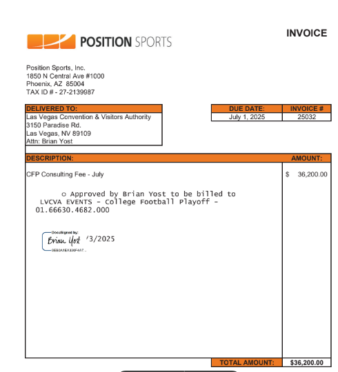 The June and July invoices from Position Sports were approved by Brian Yost, the LVCVA chief operating officer and chief sports officer.
