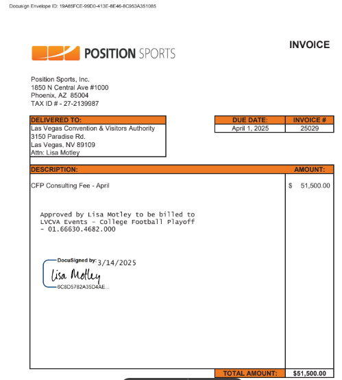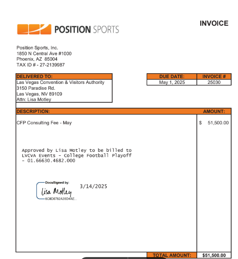 If you look at the Position Sports invoices for April and May, you will see the LVCVA wrote, “Approved by Lisa Motley.” Lisa Motley is the former LVCVA vice president of sports and special events.