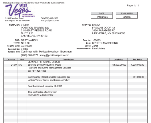 This LVCVA document shows one month payment — a unit price of $51,500 — coming out of the $1.236 million contract awarded to Position Sports, which is the “supplier.”