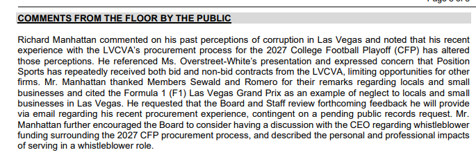 At last month’s LVCVA board meeting, a speaker during the public comments period at the end of the meeting did discuss the LVCVA college football playoff championship game bidding. Richard Manhattan of the Propyrion marketing company in Las Vegas, one of the companies that lost out to Position Sports in the CFP game job bidding process, had this to say, according to the LVCVA minutes of last month’s meeting: