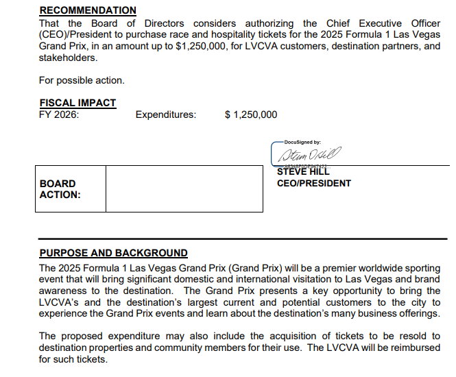 The LVCVA, already spending $20 million on F1 Las Vegas Grand Prix sponsorships, wants to spend $1.25 million on F1 tickets to give to “LVCVA customers, destination partners and stakeholders” for the road race event set for Nov. 20-22.
