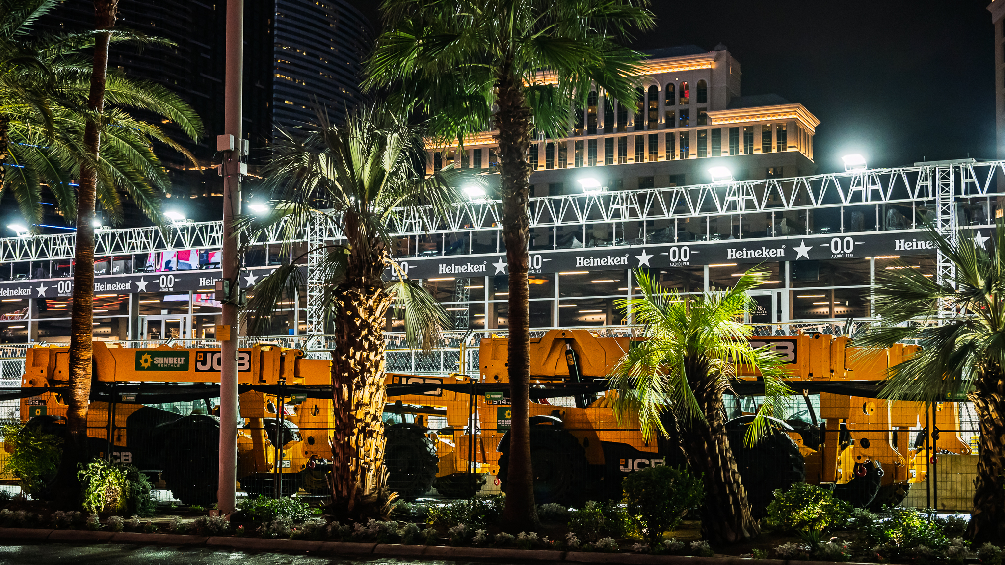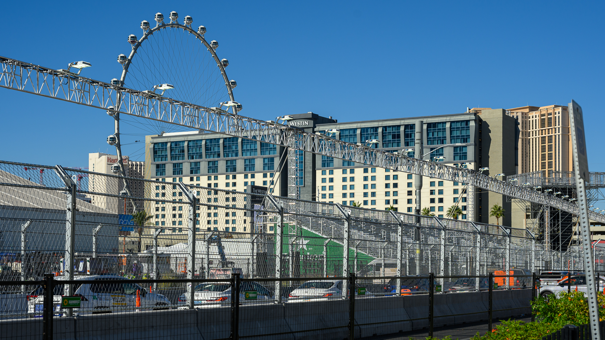 The funny thing about being on the race track is that it doesn’t feel like the Strip. For example, a temporary structure of suites and club-style open spaces in front of the Bellagio hotel-casino blocks the view of the hotel’s famed fountains and mostly what you see are concrete barriers, fencing and light mounts.