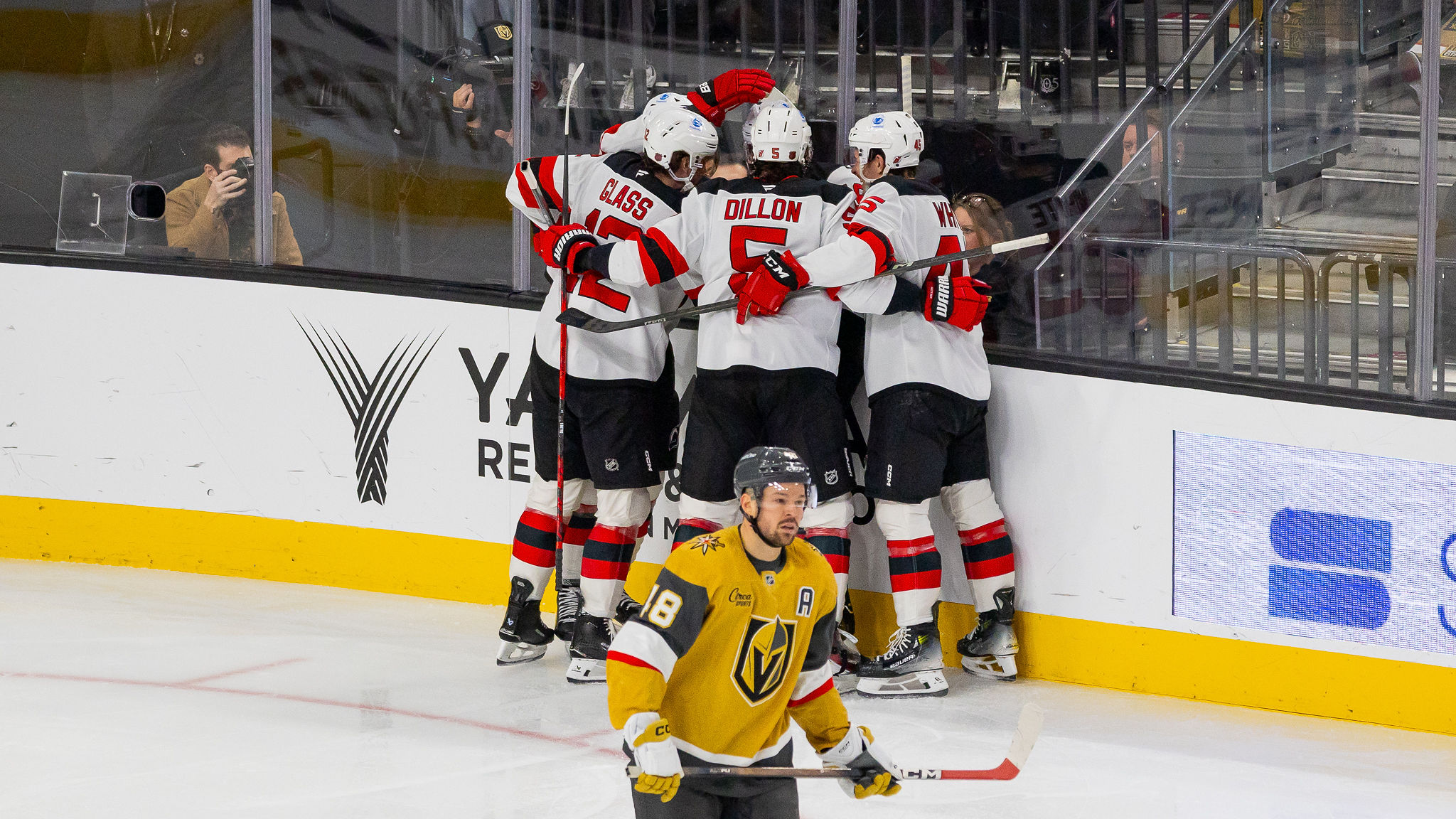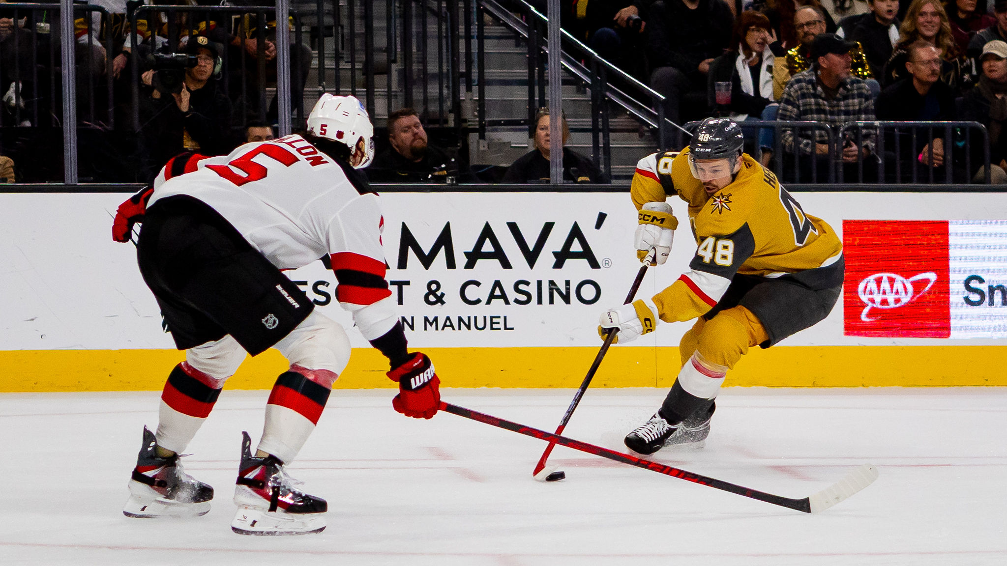 The team with a penchant for playing tied regulation games was stymied by 35-year-old Devils netminder Jack Allen, who played a rock-solid game to shut out the the Golden Knights in the shootout. Jesper Bratt scored the sole shootout tally on a nifty backhand shot.