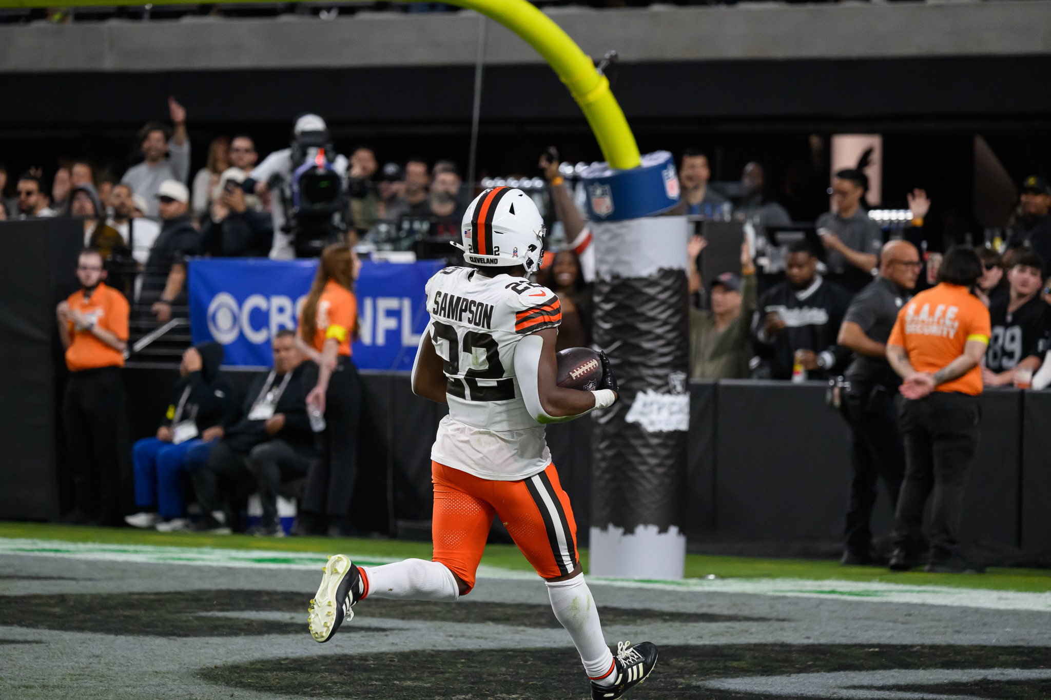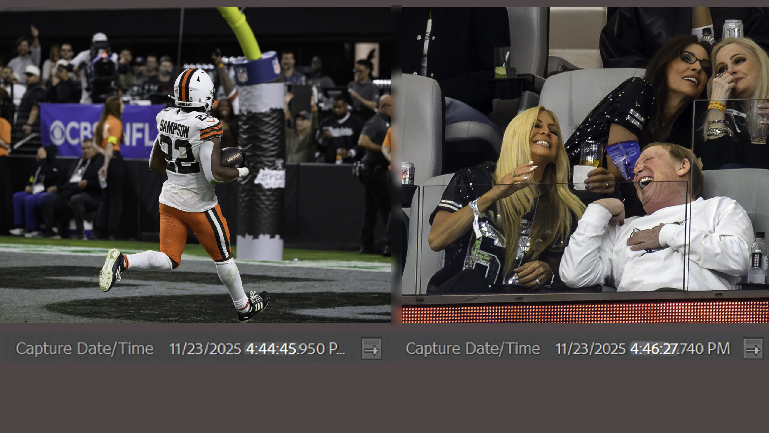 Only two minutes earlier at 4:44 PM that Sunday in November, Cleveland Browns receiver Dylan Sampson scored a touchdown to give the Browns a 24-3 lead over the Raiders with eight minutes and 18 seconds left in the game, according to a LVSportsBiz.com photo time stamped at 16:44, or 4:44 PM.