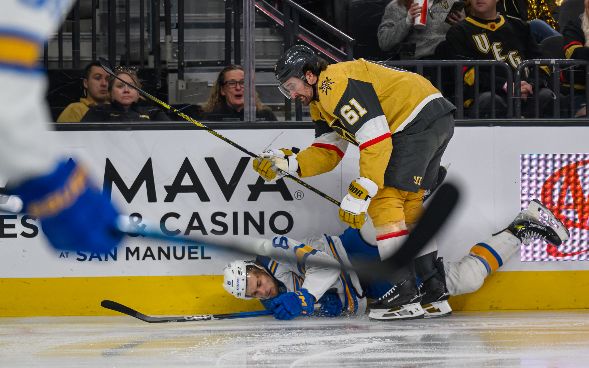 In the third period, VGK’s Pavel Dorofeyev was boarded/cross-checked by the Blues’ Tyler Tucker but somehow the ref called the penalty on Dorofeyev.