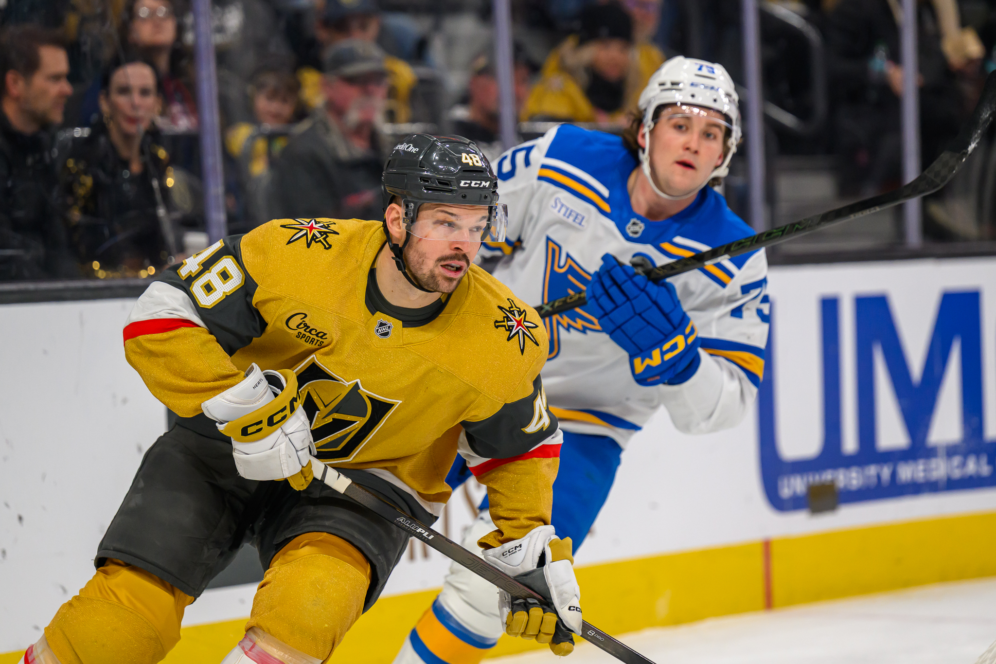 Vegas tied the score later in the first period on a goal by Mitch Marner, then added goals by Jack Eichel and Shea Theodore in the second period for a VGK 3-1 lead over St. Louis after 40 minutes.