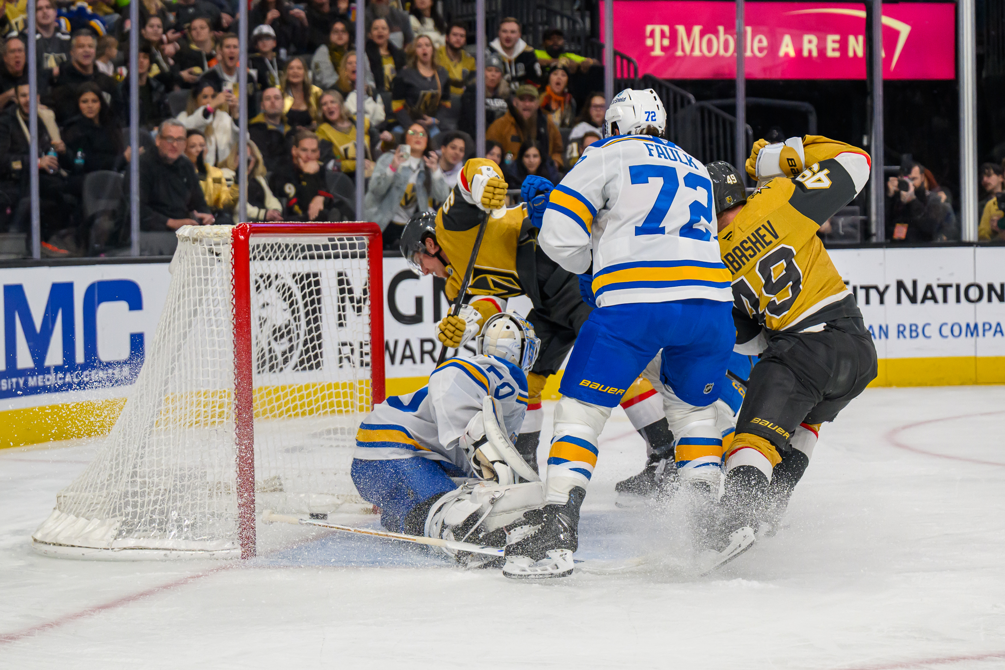 The puck took a bizarre bounce off the back wall boards behind the Knights goal and VGK goalie Akira Schmid had no clue where the puck landed. The puck came right to St. Louis center Robert Thomas who deposited the puck into the empty net while Schmid was looking the other way.