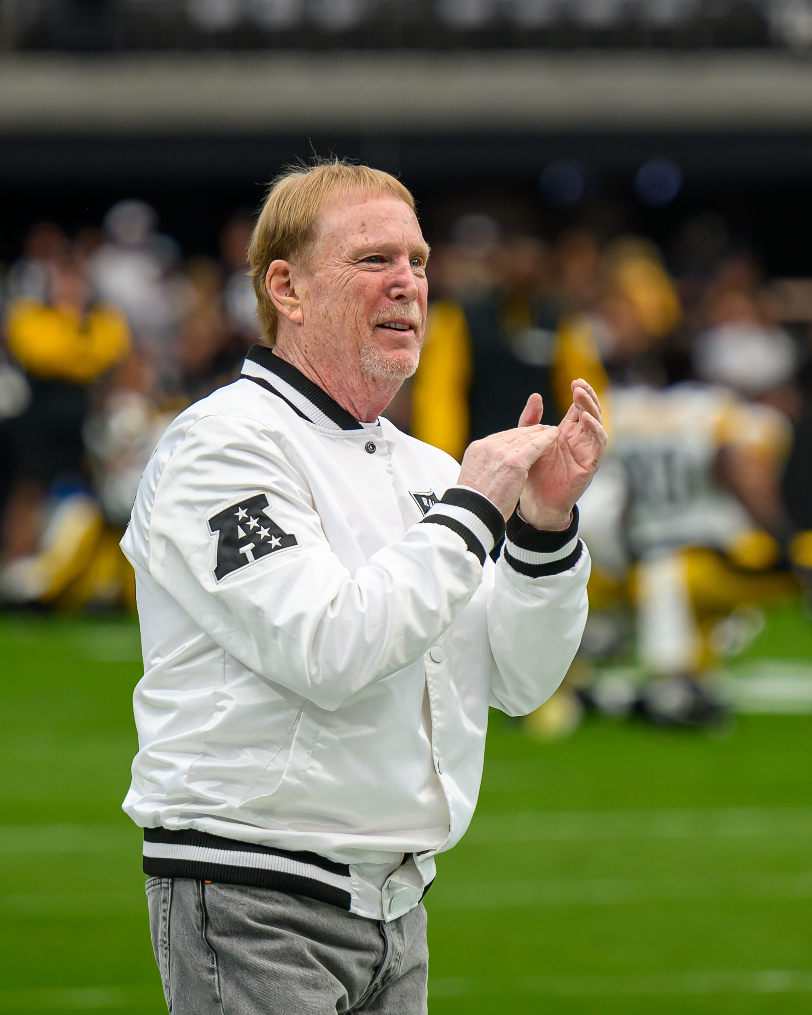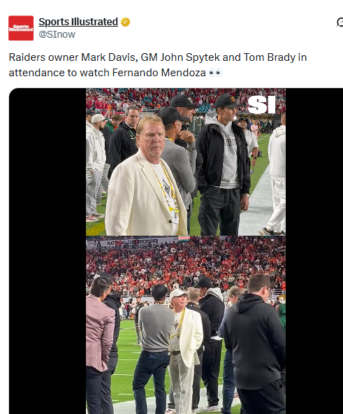 Davis was joined by Raiders minority owner Tom Brady and team general manager John Spytek on the sidelines of the game that matched Indiana and Miami. The Hoosiers took the game, 27-21, to win the CFP national championship.
