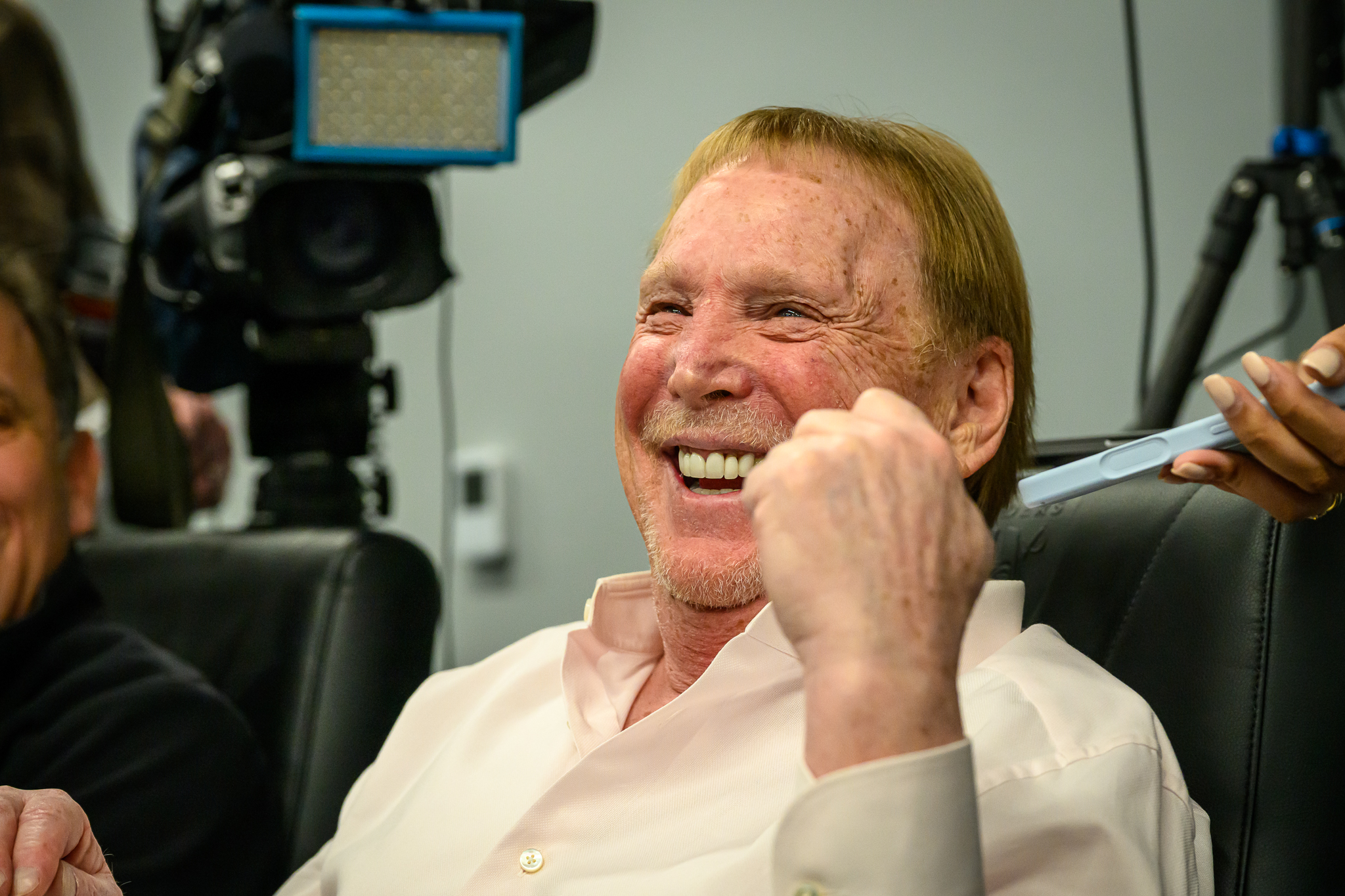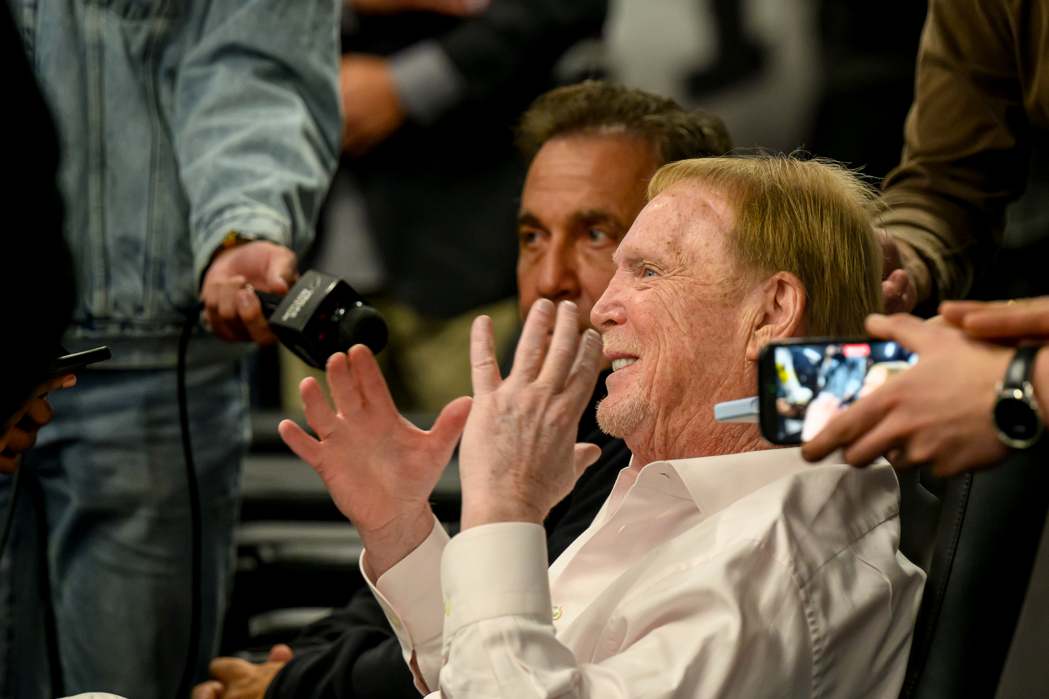 Raiders owner Mark Davis sat in the back of the team’s meeting room and only chatted with media after the 38-minute press conference ended.