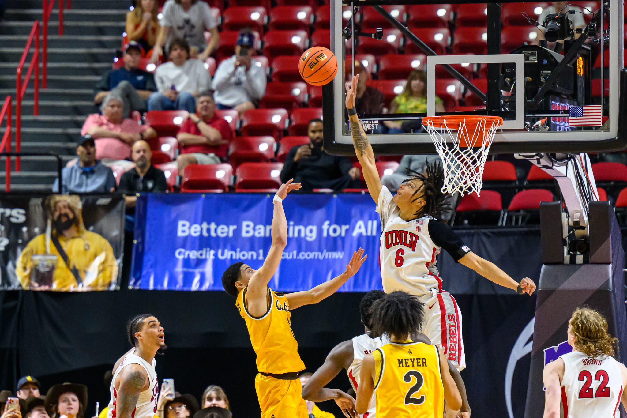 This might be UNLV’s basketball arena, but the Mountain West tries its best to make it a neutral site by covering up all UNLV branding and bringing in its own hardwood court. You will hear announcements for Mountain West sponsors like Old Trapper and not UNLV sponsors.