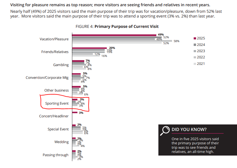 LAS VEGAS, Nevada — Las Vegas’ tourism boosters like to talk about how sports tourism is a new frontier for the local hospitality industry, but the LVCVA’s own data showed only three percent of all visitors came here to attend a sports event in 2025 when tourism dropped 7.5 percent in Las Vegas.