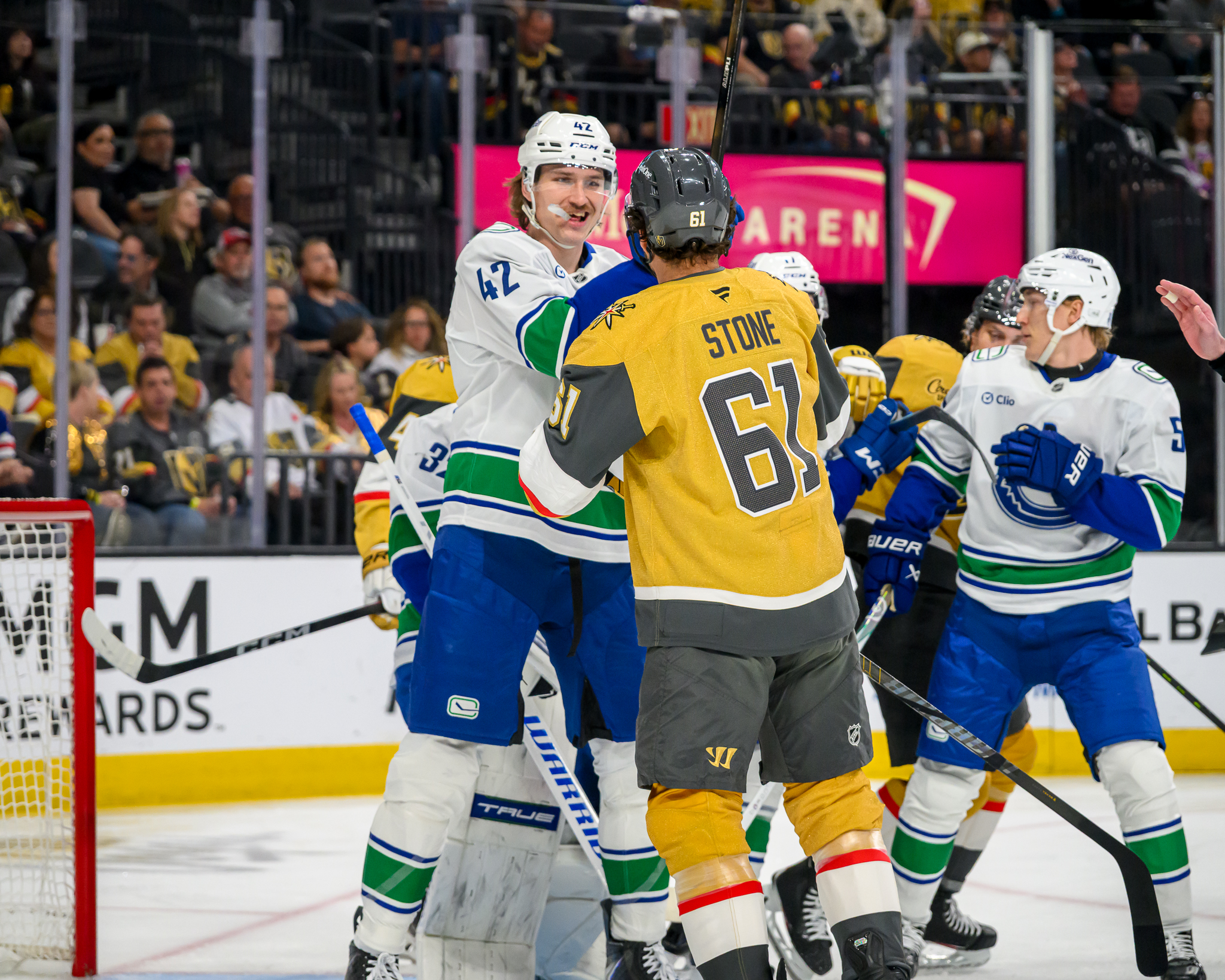 The game started slowly for Vegas, with not much energy on the ice and in the building as Vancouver took a 1-0 lead on a goal by an old Vegas foe, Evander Kane, his 339th of his career.