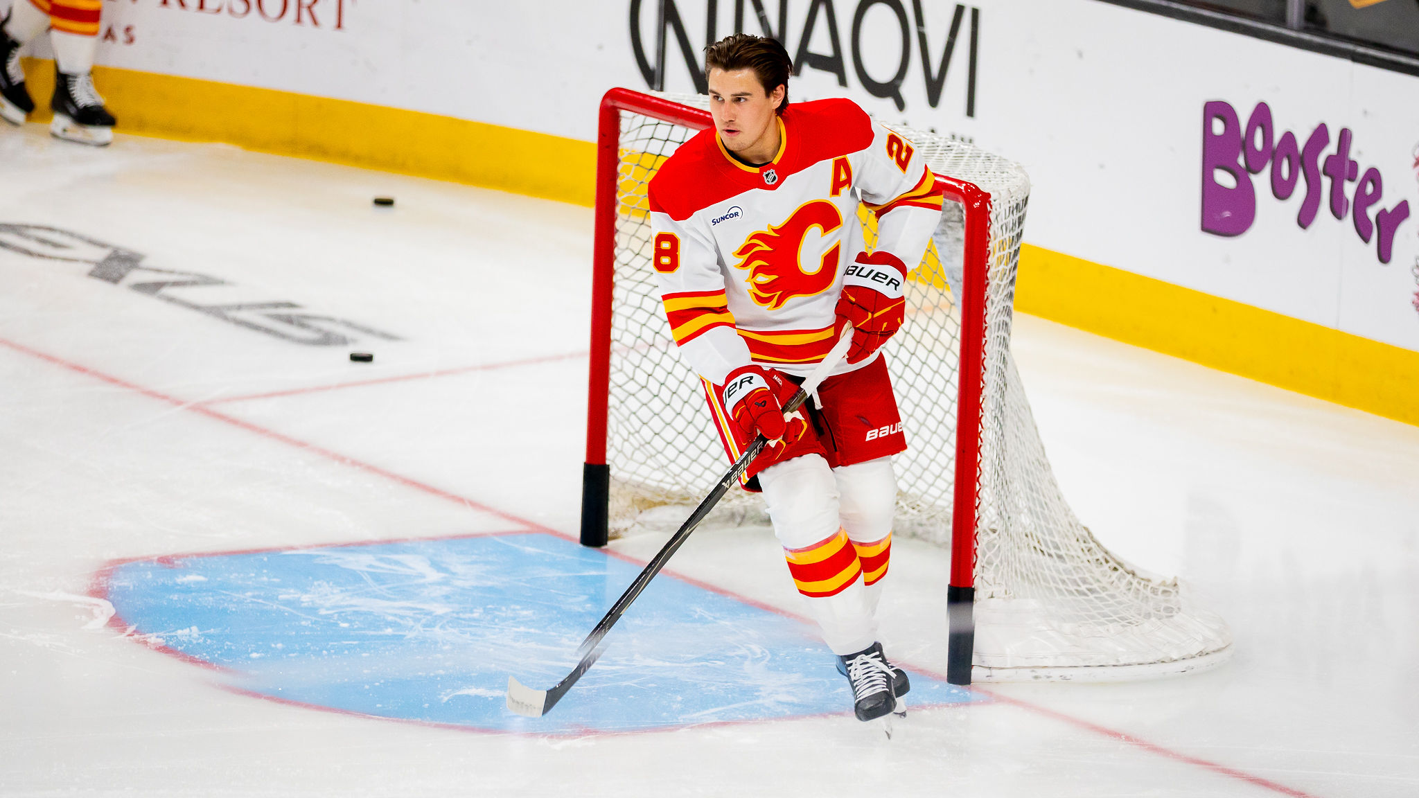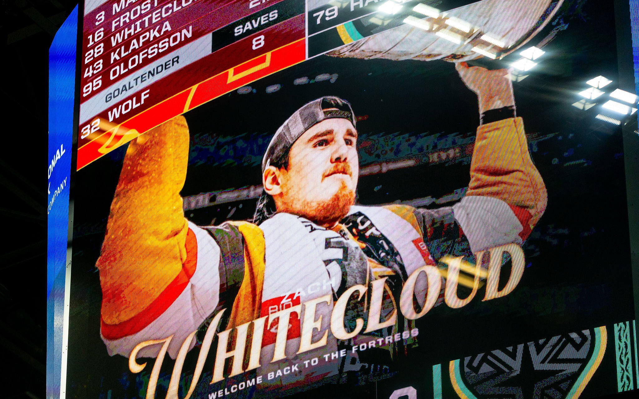 The Flames’ Zach Whitecloud, a former popular Golden Knights defenseman, drew a huge reception from the crowd in the first period when Vegas played a nice tribute video for Whitecloud’s first visit as an opposing player.