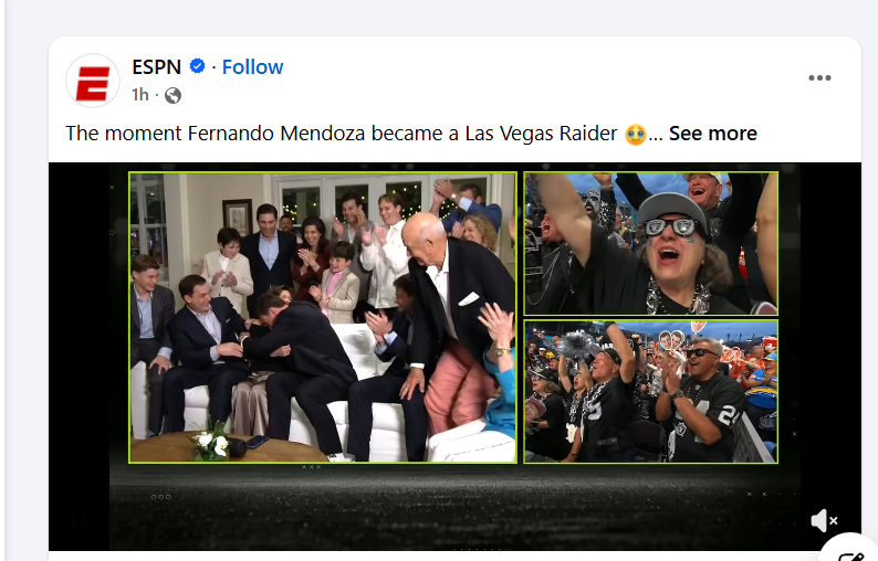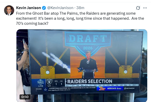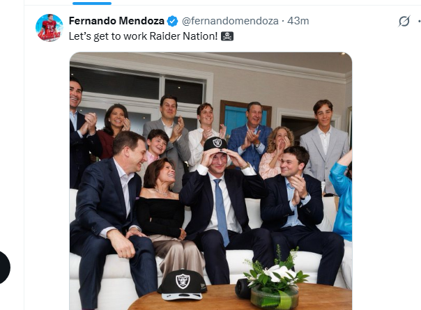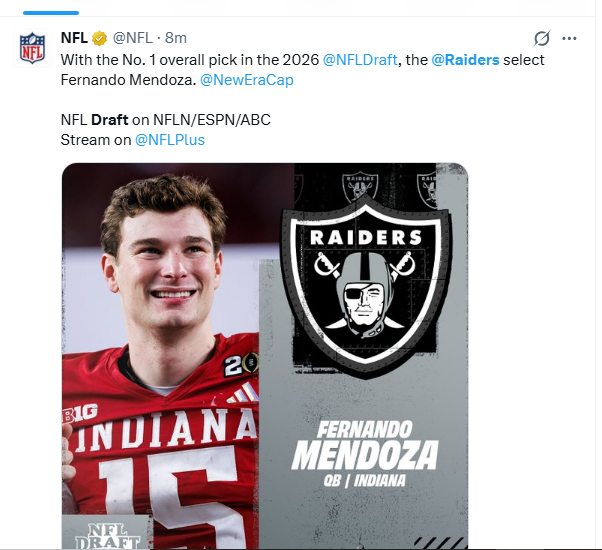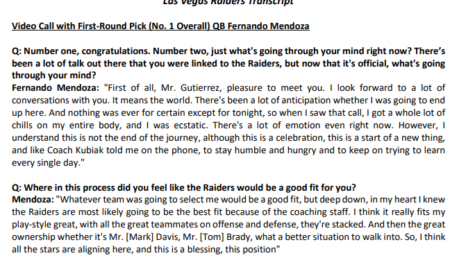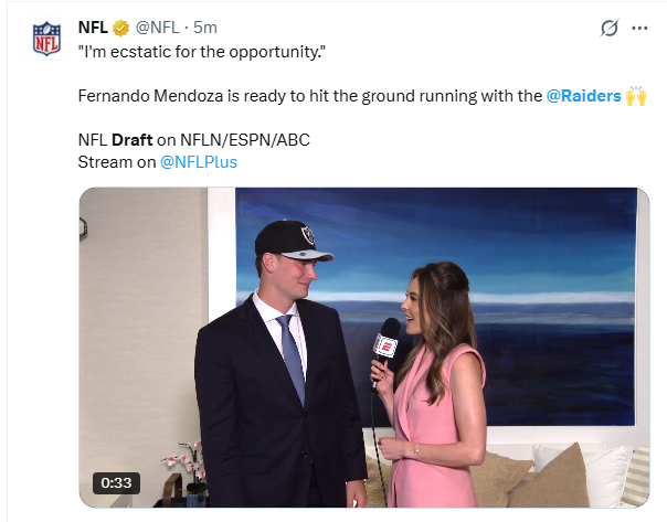 “I’m looking forward to getting to work,” Mendoza told a TV reporter after NFL Commissioner Roger Goodell called his name at 5:13 PM Las Vegas time. Of the Raiders, Mendoza said, “Great legacy.”