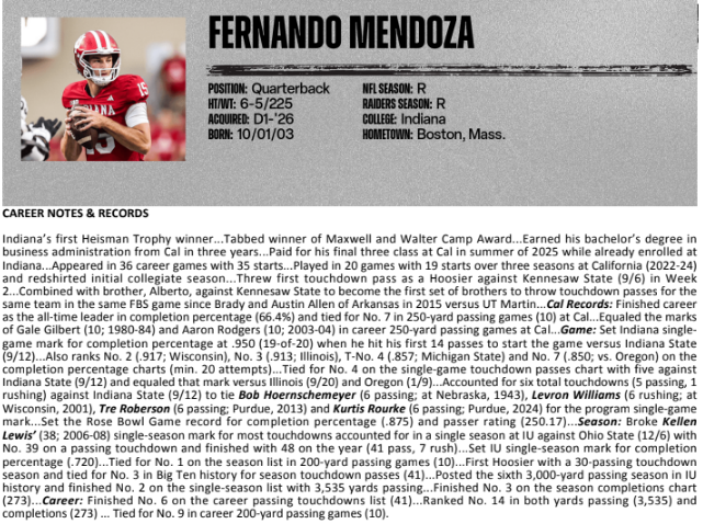 Coming off an awful season that resulted in a 3-14 record in 2025, the Raiders used their top draft selection on a talented and cerebral QB who led Indiana to college football’s national championship and an undefeated season.