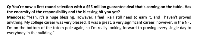 Mendoza talked about being “humble and hungry” and ready to work with Kubiak. He comes off as genuine, religious and prepared to assume the role — eventually — of the team’s franchise quarterback.