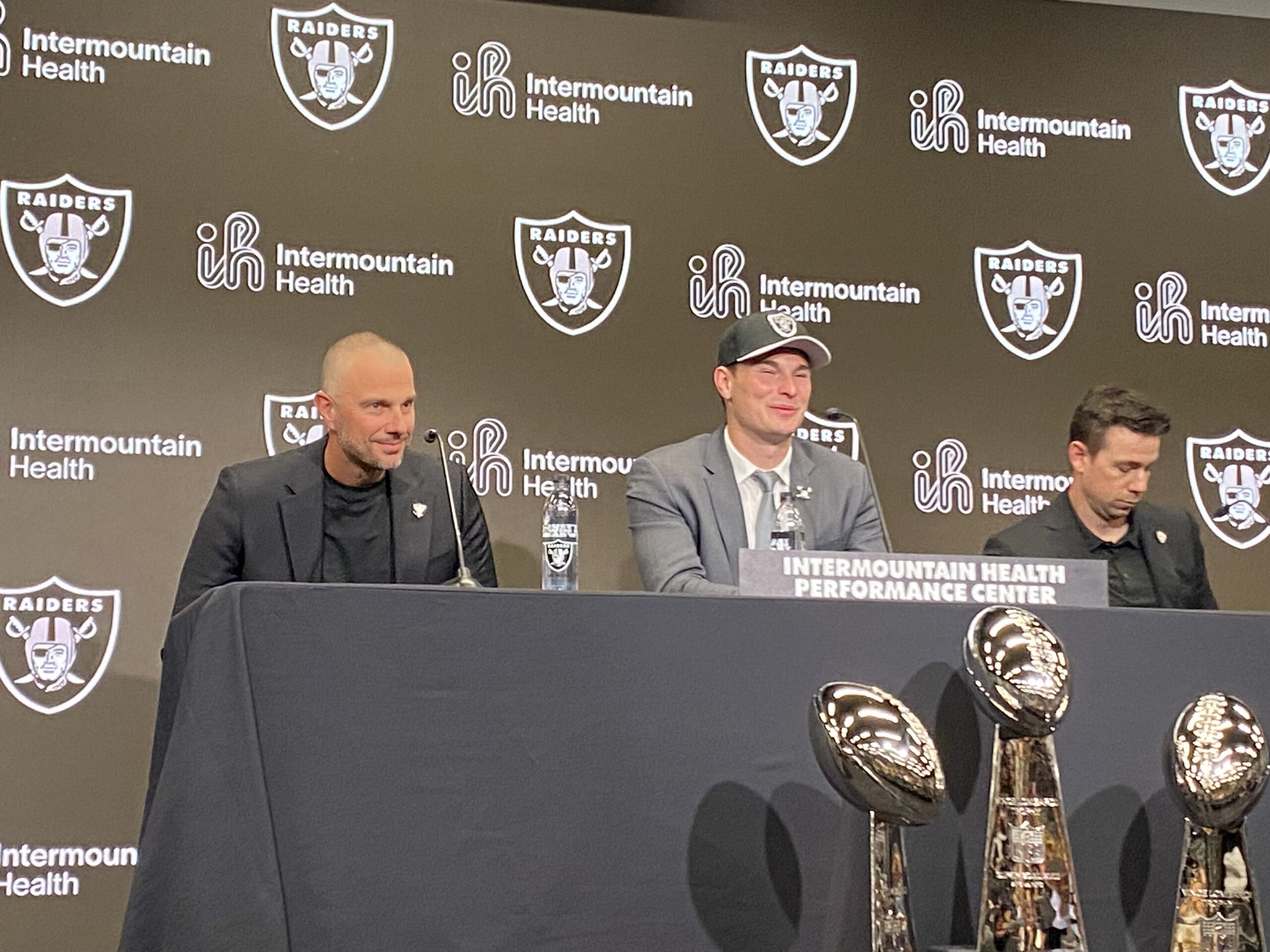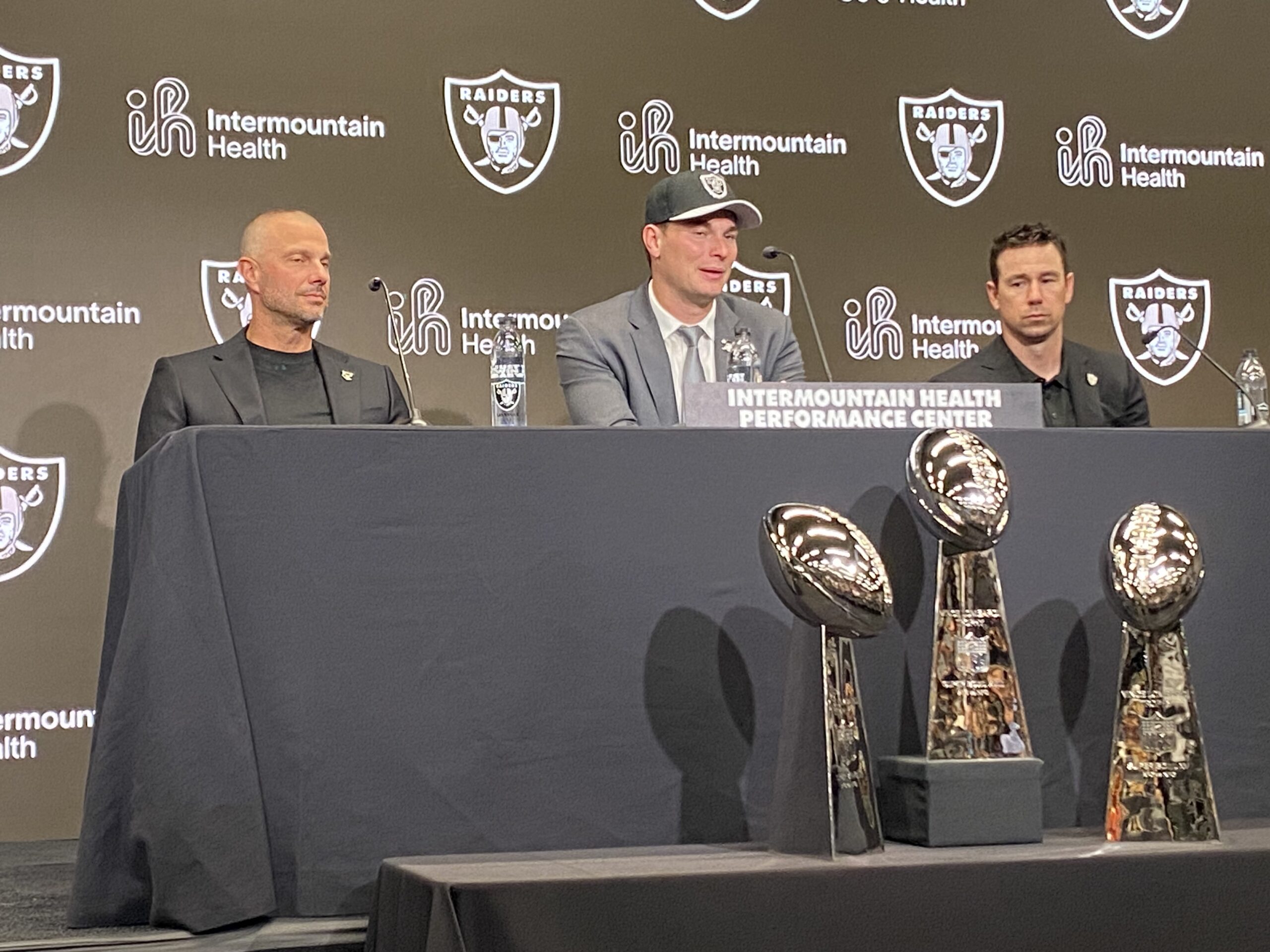 As usual, the Raiders rolled out their three Super Bowl trophies, arranged in front of the presser table. The NFL championship years were 1976, 1980 and 1983 for those trio of trophies.