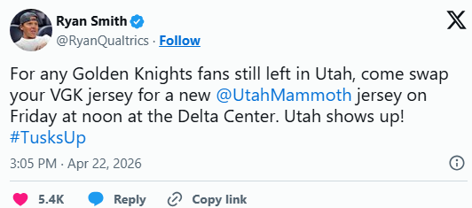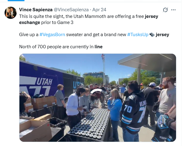 Well, the Utah Mammoth — in Year 2 — pulled a VGK-like move and welcomed 7,000 hockey fans who traded in their Golden Knights jersey for a new Mammoth sweater before Game 3 Friday.