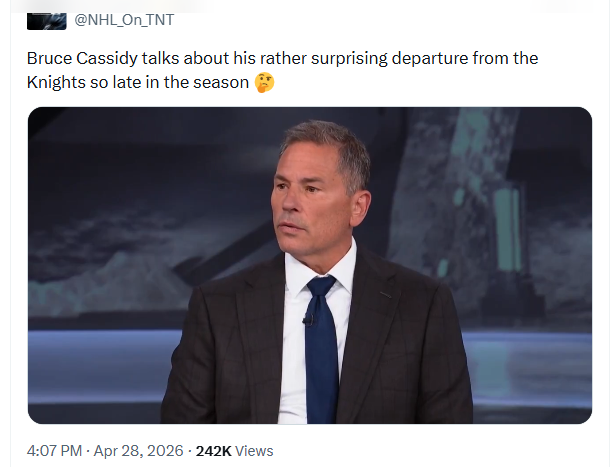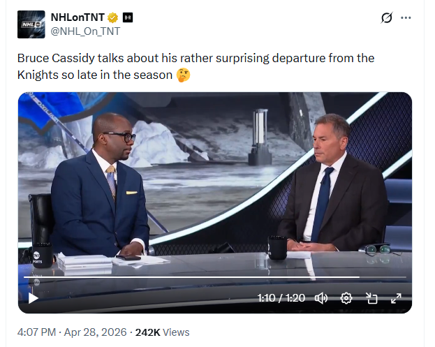 Cassidy was on the NHL on TNT analyst show Tuesday night when the former Golden Knights coach commented on the Boston/Buffalo and Anaheim/Edmonton playoff games.
