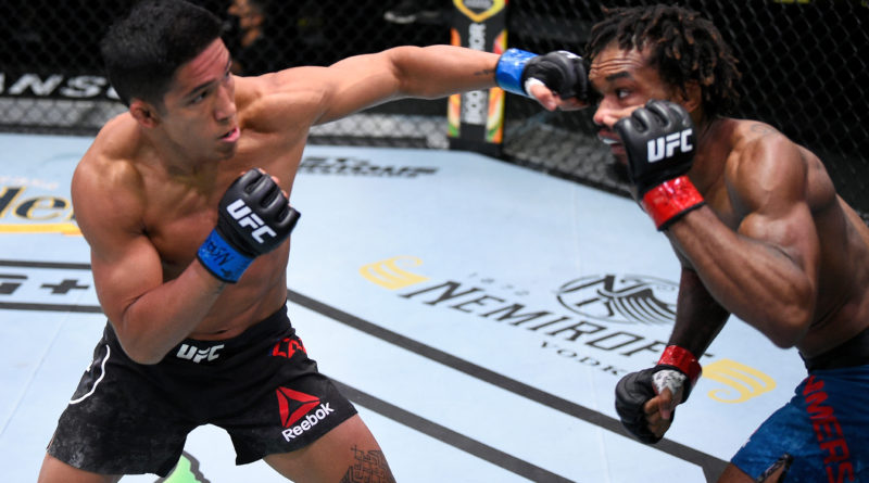 LAS VEGAS, NEVADA - AUGUST 01: (L-R) Vince Cachero punches Jamall Emmers in their featherweight fight during the UFC Fight Night event at UFC APEX on August 01, 2020 in Las Vegas, Nevada. (Photo by Chris Unger/Zuffa LLC via Getty Images)