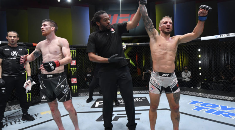 LAS VEGAS, NEVADA - JULY 24: T.J. Dillashaw reacts after his split-decision victory over Corey Sandhagen in their bantamweight fight during the UFC Fight Night event at UFC APEX on July 24, 2021 in Las Vegas, Nevada. (Photo by Jeff Bottari/Zuffa LLC)