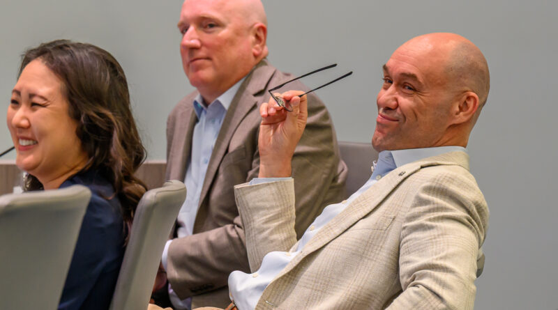 LVCVA Chief Strategy Officer Ed Finger (right) leans back at Tuesday's board meeting. Finger is overseeing the CFP title game contract bidding process at the LVCVA. Photo credit: Hugh Byrne/LVSportsBiz.com