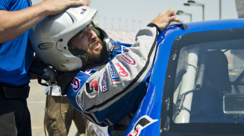 Golden Knights defenseman Deryk Engelland was crammed into a race car Monday and liked the spin around the speedway track.