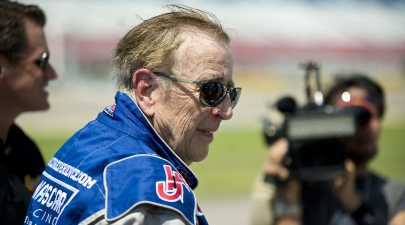 Even sports broadcaster Brett Musberger was used to help promote the South Point 400 when he rode a race car during the Golden Knights-Speedway event. Photo credit: Daniel Clark/LVSportsBiz.com