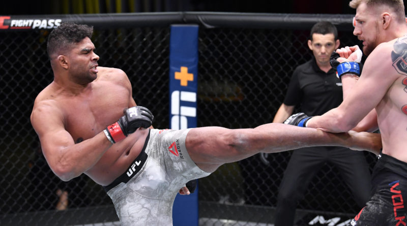 LAS VEGAS, NEVADA - FEBRUARY 06: (L-R) Alistair Overeem of the Netherlands kicks Alexander Volkov of Russia in their heavyweight fight during the UFC Fight Night event at UFC APEX on February 06, 2021 in Las Vegas, Nevada. (Photo by Chris Unger/Zuffa LLC)