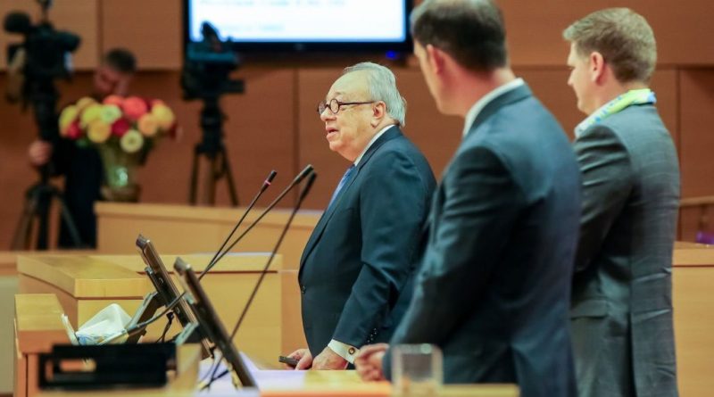 Las Vegas Mayor Carolyn Goodman (left) chats with Renaissance Companies Managing Partner Candice Rauter, Las Vegas Lights owner Brett Lashbrook Renaissance Chairman Floyd Kephart (left to right, standing) at a June city council meeting.