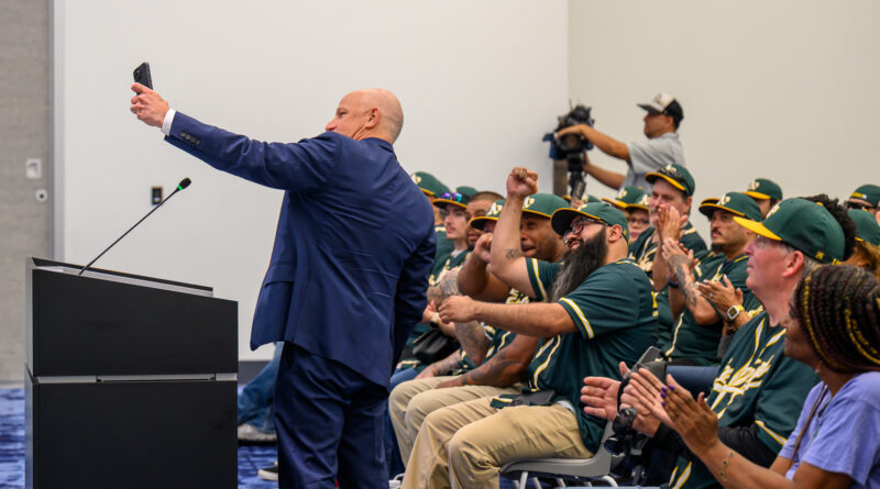 Selfie time for A's team president Marc Badain and the 872 local Laborers union members.